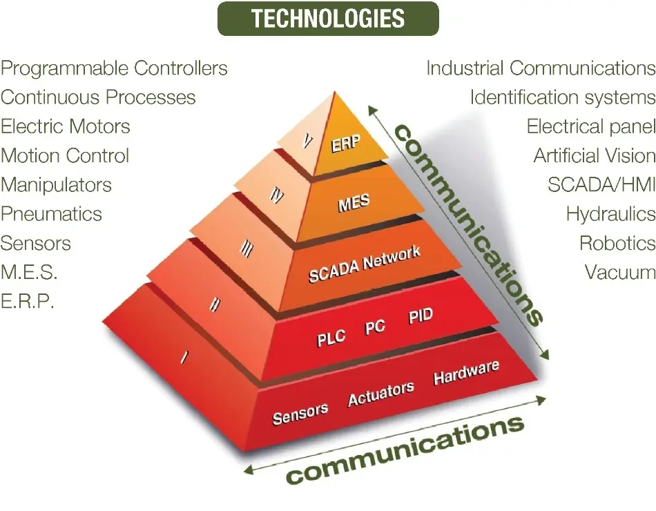 Questa evoluzione è resa possibile grazie all'integrazione di tecnologie classiche con altre più moderne come l'elettronica, l'informatica; le comunicazioni giocando il ruolo più importante giorno dopo giorno. Questa integrazione delle tecnologie è ben rappresentata dall'utilizzo di una "Piramide dell'Automazione", che comprende i cinque livelli tecnologici che possono essere considerati in un ambiente industriale.